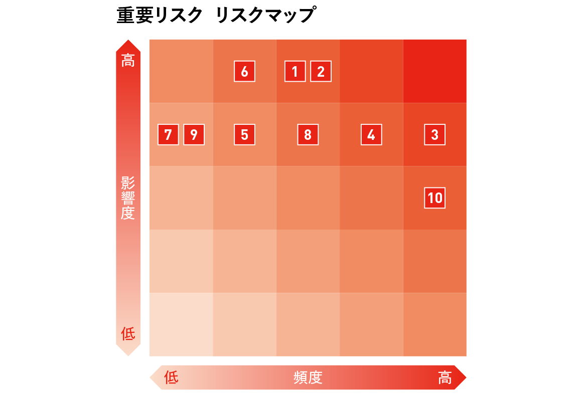 当社グループでは、潜在的なリスクを発生頻度と事業影響度の観点からリスクマップに整理し、その中で経営に重大な損失を及ぼす可能性のあるリスクを「重要リスク」と位置づけて管理体制を構築しています。