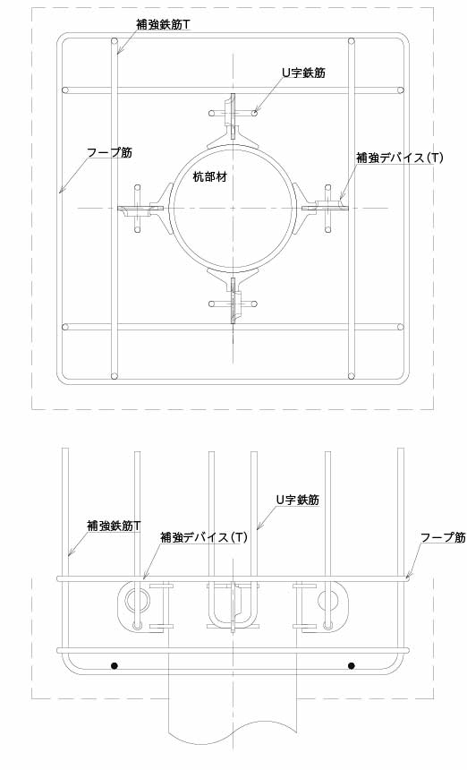 | 補強デバイス(T)の高さ配置 | 杭端部より15mm以上離す 水平に同一高さとする |