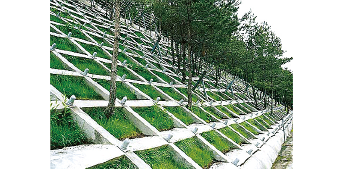 フリーフレーム工法は、合理的な金網型枠の特性と吹付工法の特徴を活かして、切土法面・自然斜面などに連続した枠を造る工法です。斜面の安定を図ると共に緑化工などを施工することによって、自然環境との調和を大切にした工法として広く採用されています。